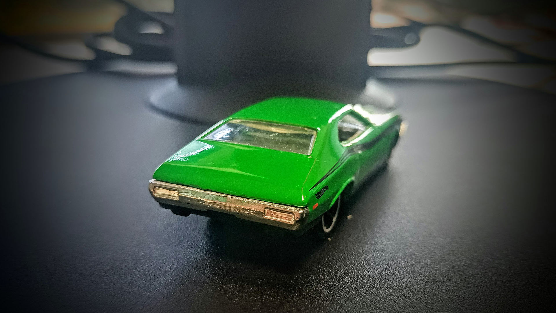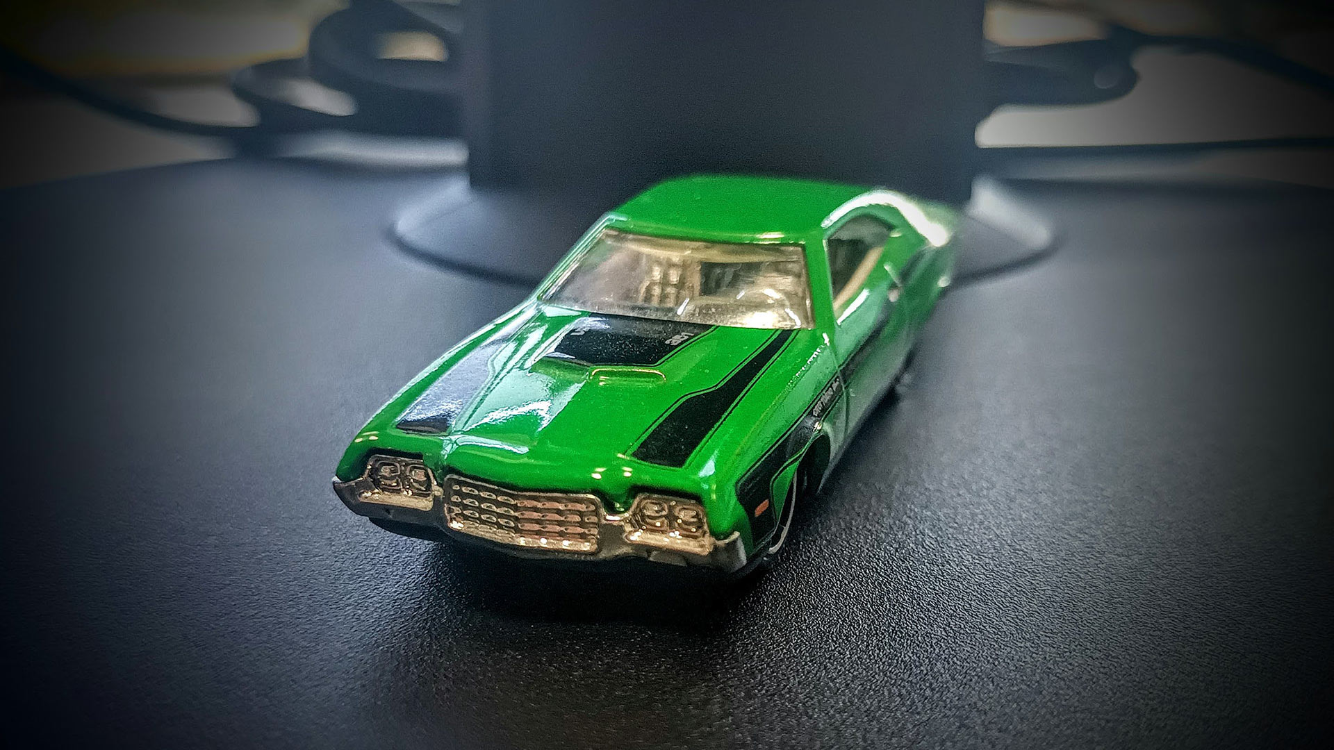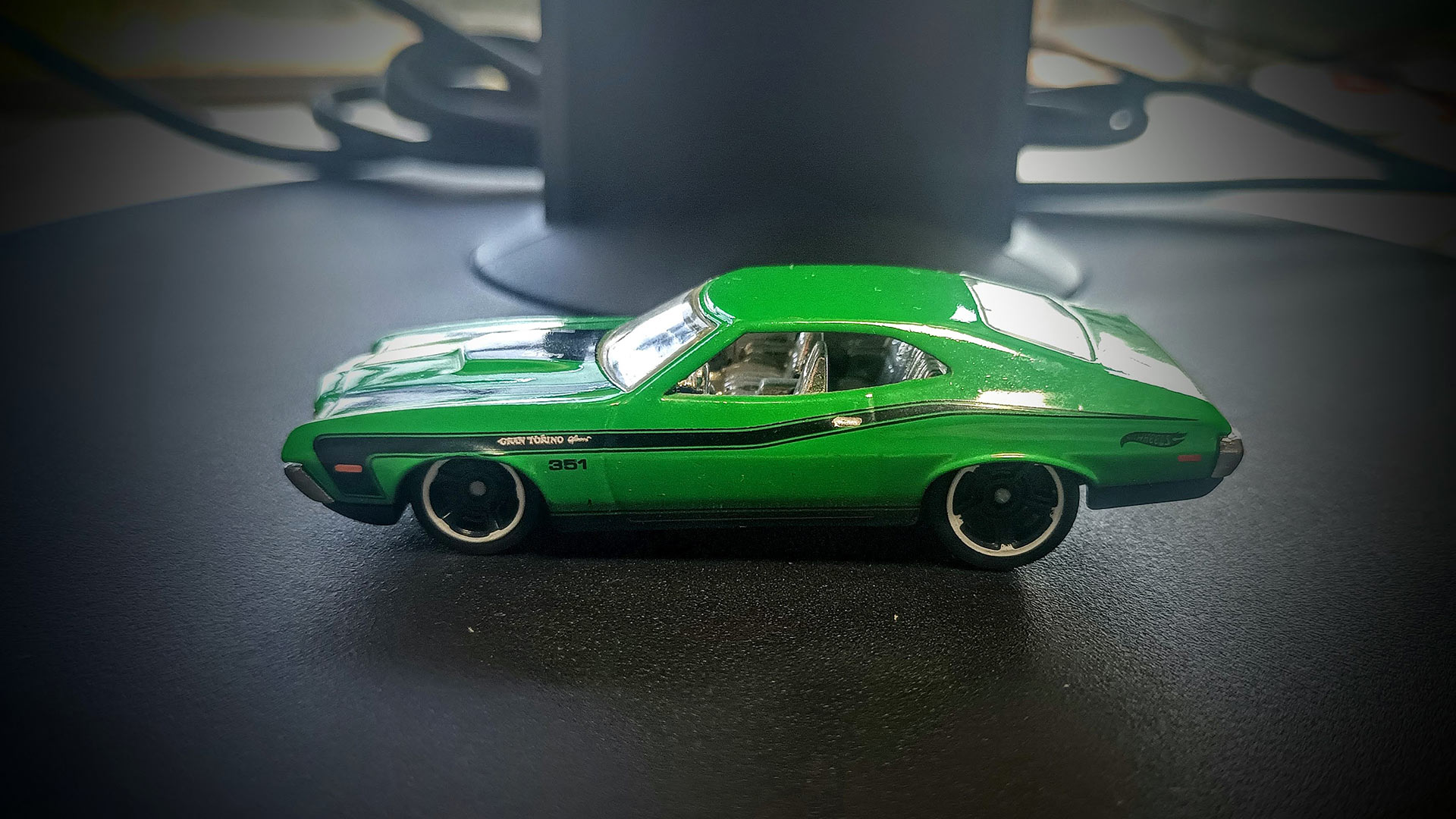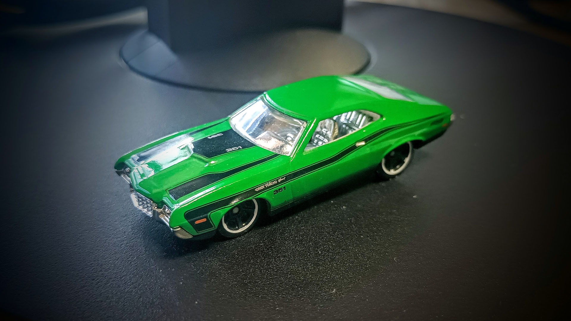 L’Hot Wheels ’72 Ford Gran Torino Sport, raffigurata in foto e uscita nel 2012, fa parte della serie Muscle Car Mania: Ford. Il modellino presenta uno chassis composto da un blocco superiore in metallo verniciato verde e un blocco inferiore in plastica nera. Tra i due, è inserita una parte in plastica cromata color argento che forma l’anteriore della macchina (radiatore, gruppi ottici e paraurti), il posteriore (paraurti) e gli interni dell’abitacolo.