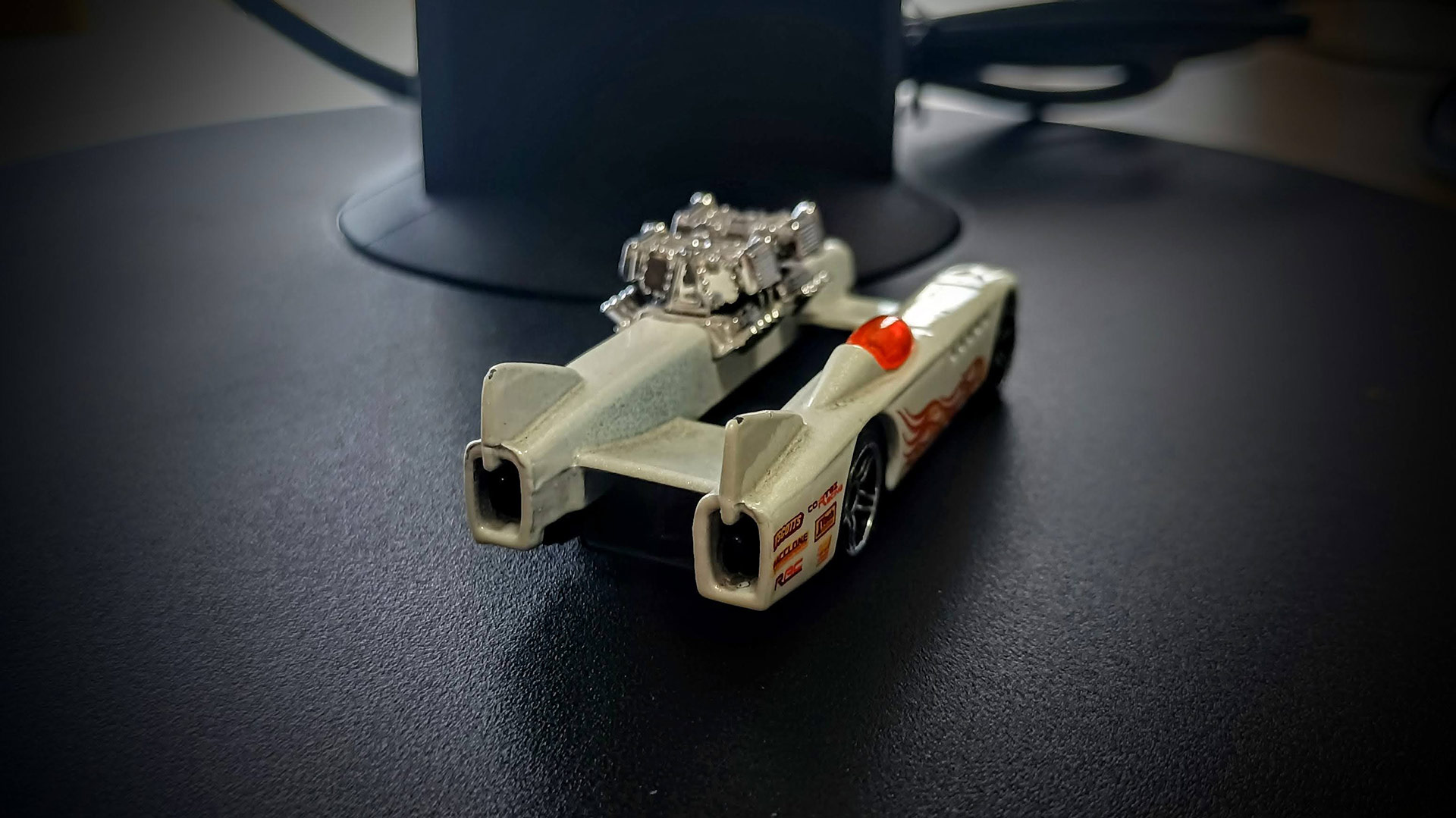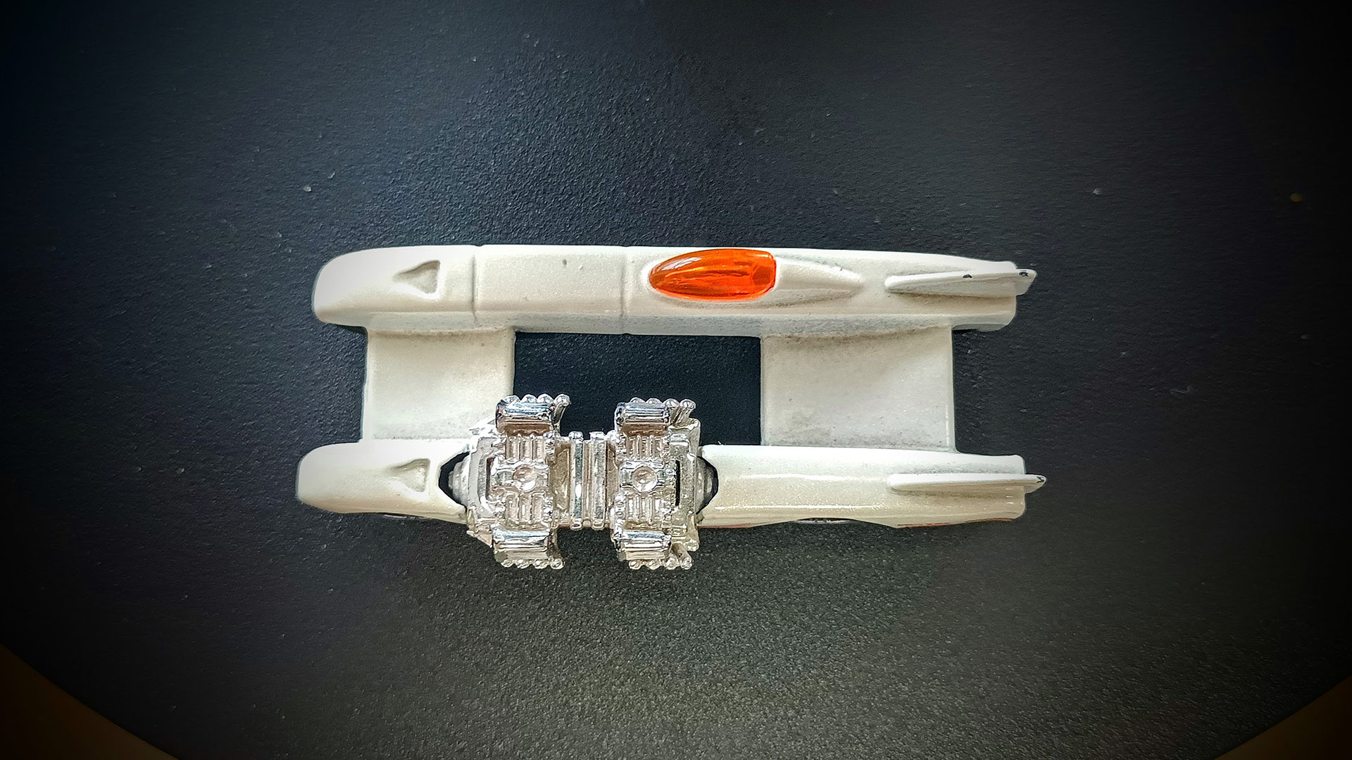 Sul lato sinistro troviamo riprodotto un imponente motore formato da un doppio V8 di plastica cromata, mentre sulla destra, l'abitacolo, che ricorda una cabina da pilota di caccia della II Guerra Mondiale, realizzato in plastica trasparente arancione.