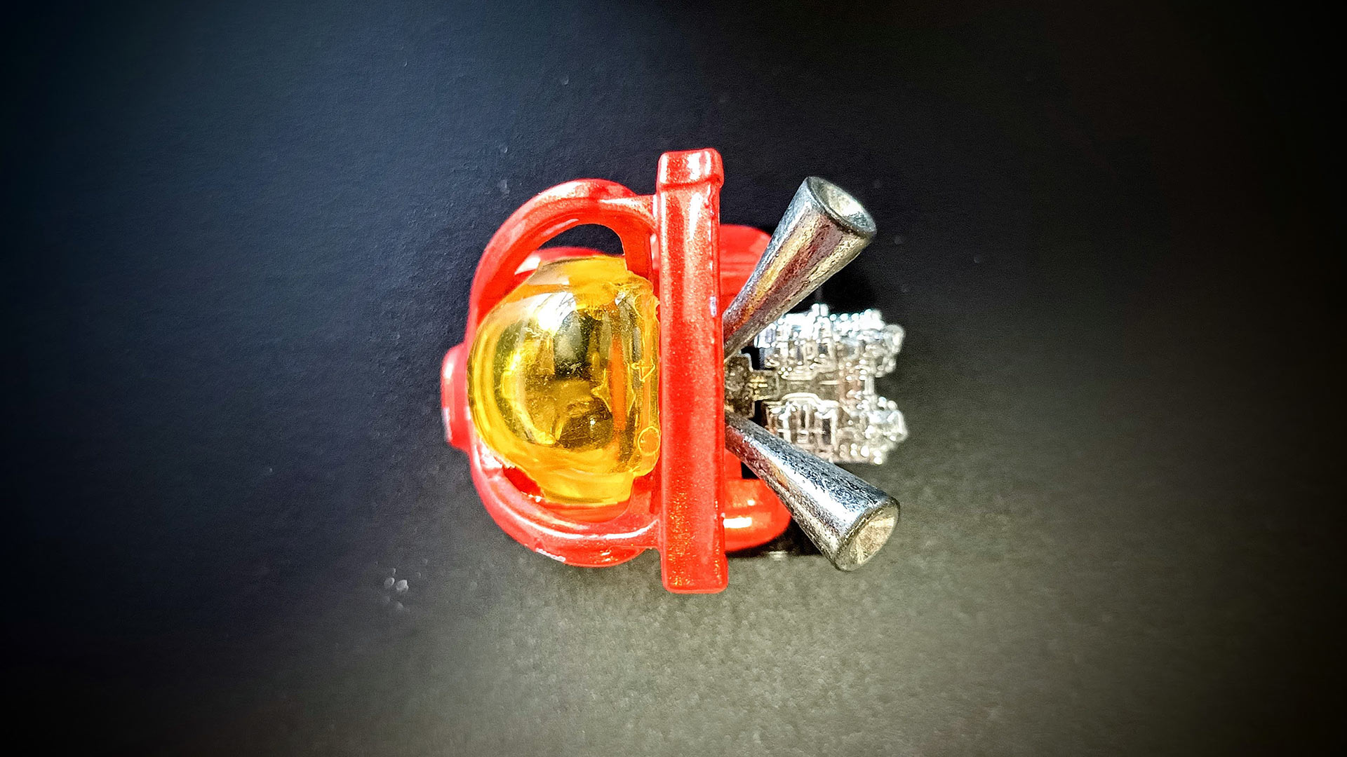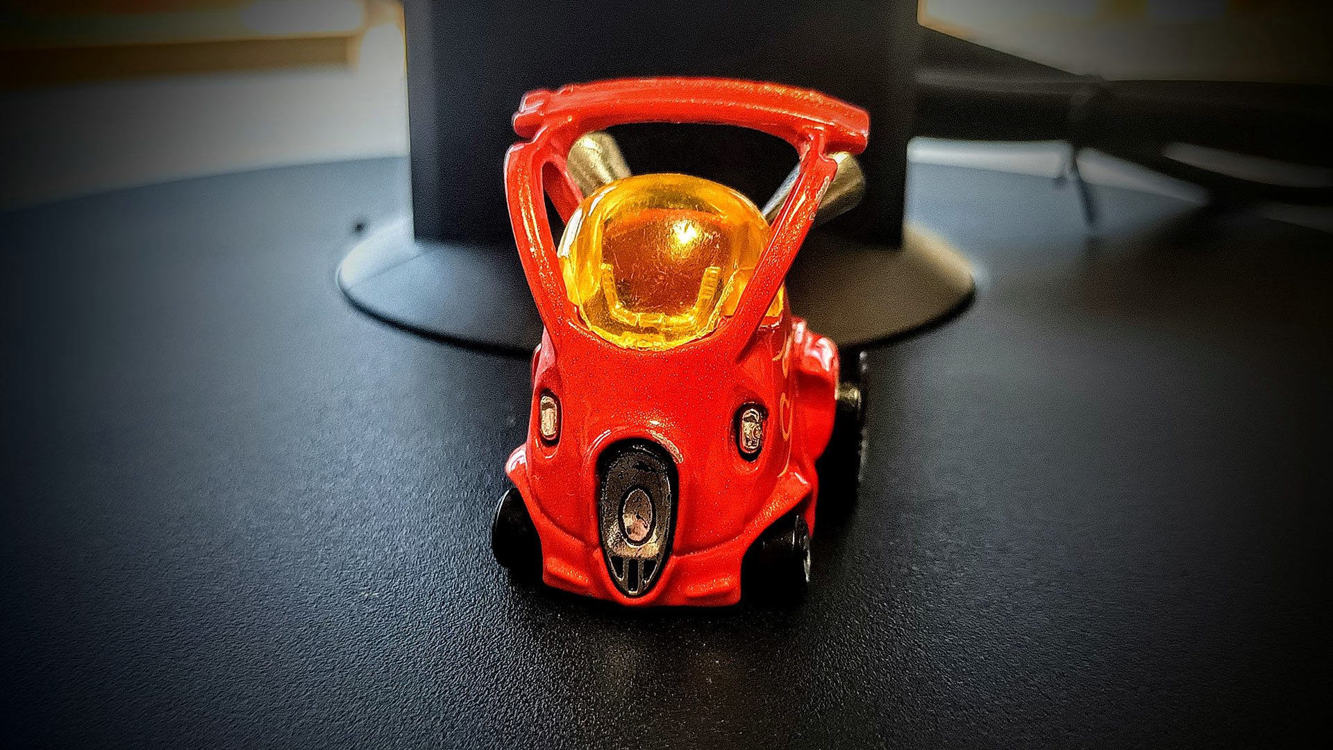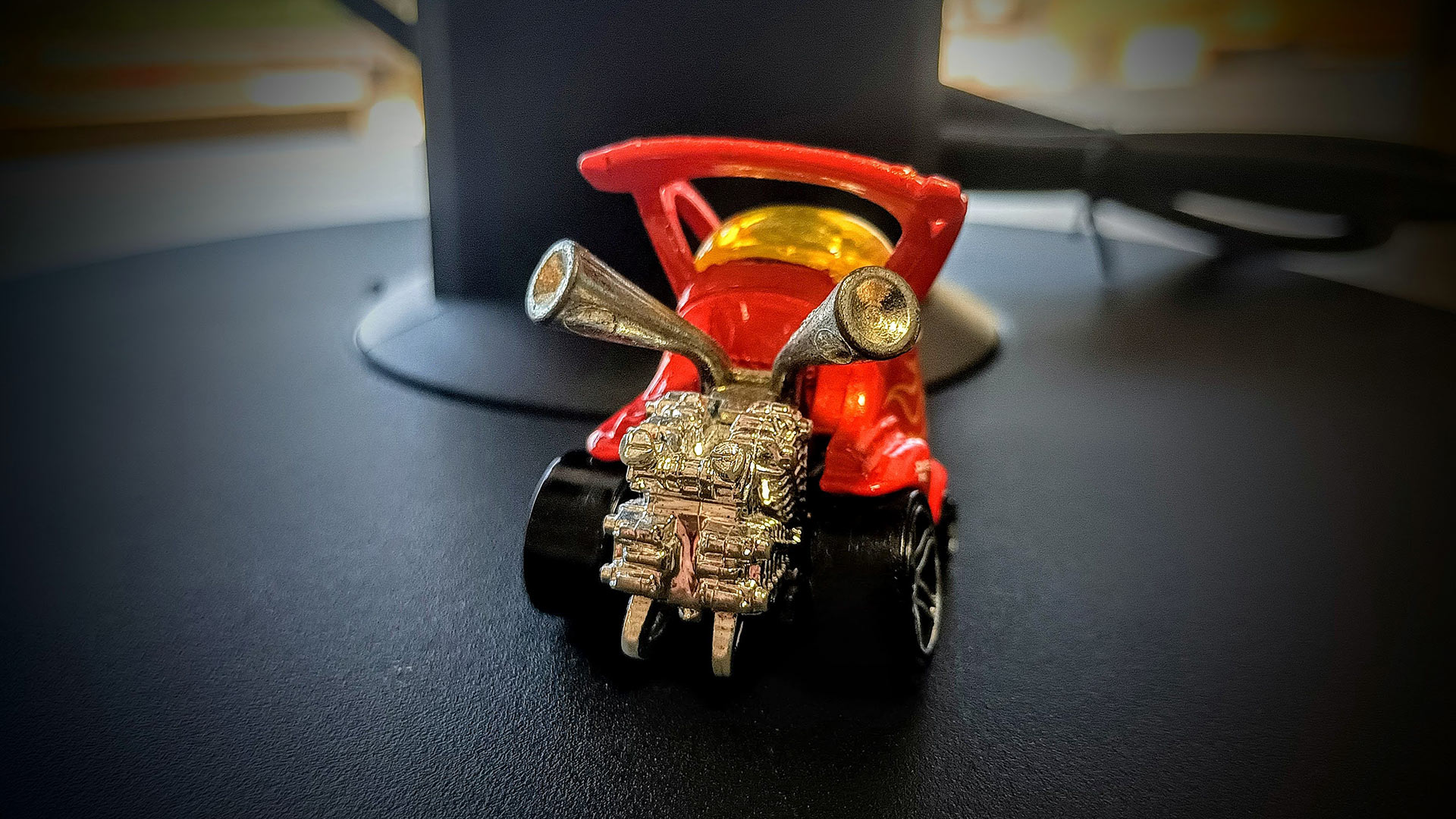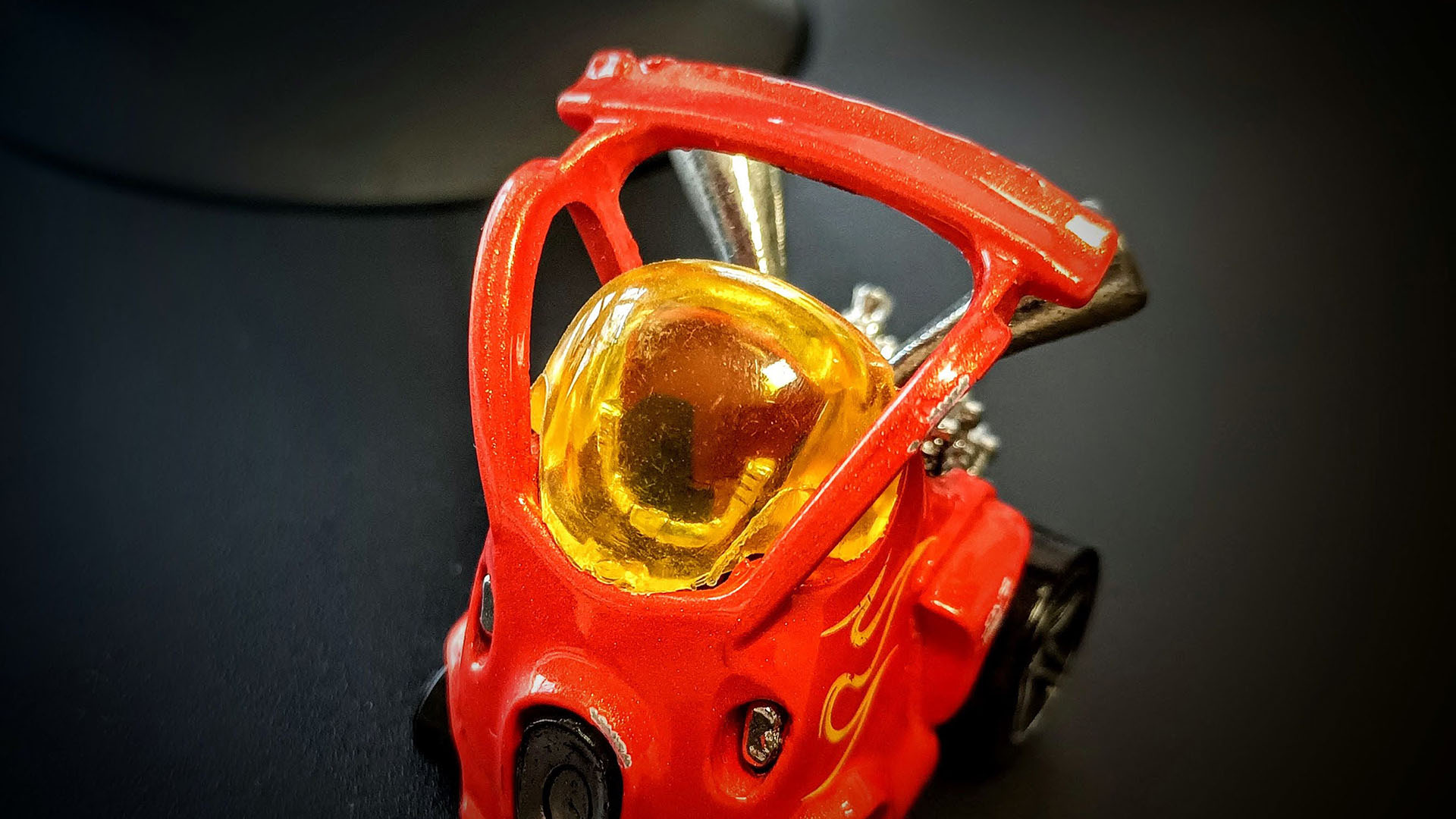 L'abitacolo monoposto è caratterizzato da un manubrio da bicicletta sovrastato da una calotta in plastica gialla trasparente. Seguono 2 grandi tubi di scappamento a forma di cono in metallo che si innestano con un doppio motore bicilindrico a V da motocicletta in plastica cromata.