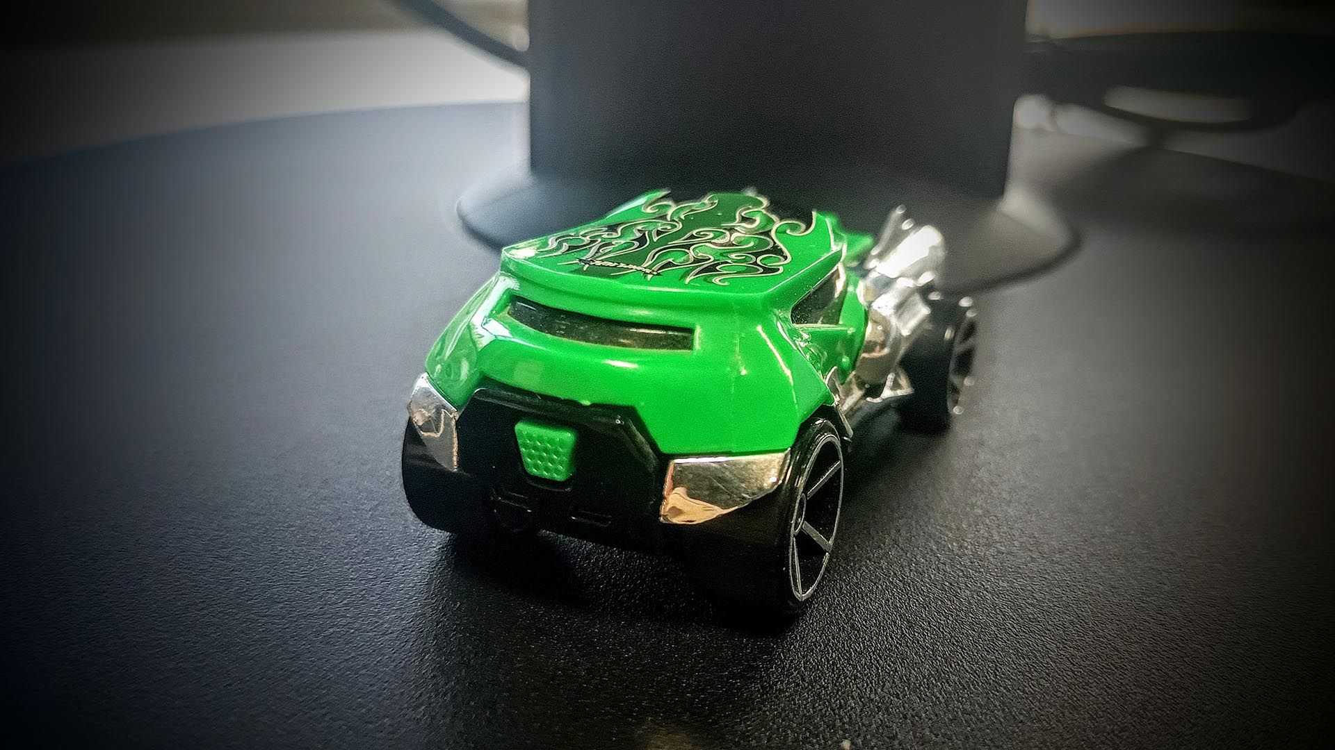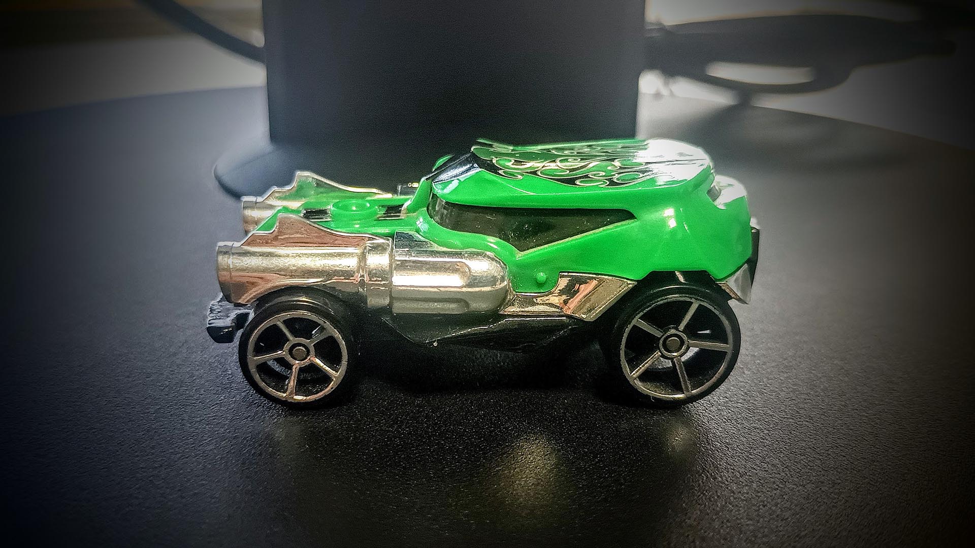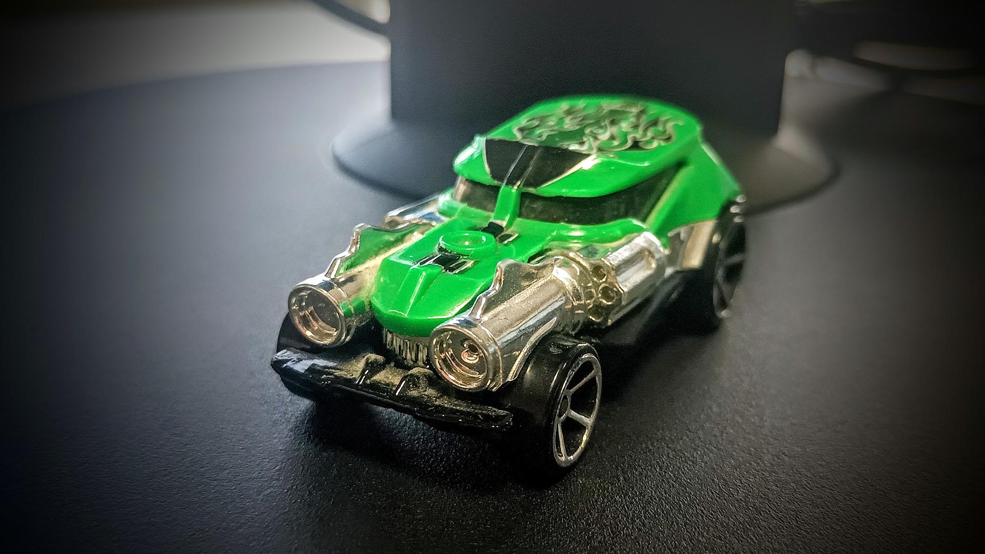 Lo châssis di questa versione (2011 HW Video Game Heroes) è in metallo verniciato nero, mentre la carrozzeria è composta da un elemento in plastica verde che definisce l’abitacolo e il cofano. Quest’ultimo è innestato su una parte in plastica cromata che, lateralmente, dà forma a due canne di pistola con le bocche di fuoco al posto dei fanali anteriori, per poi proseguire verso la parte posteriore del modello con la forma del tamburo e un profilo che arriva a ridosso della ruota, terminando ai lati del posteriore.