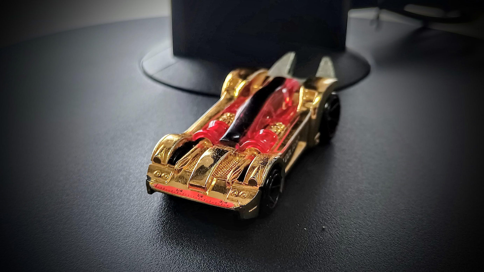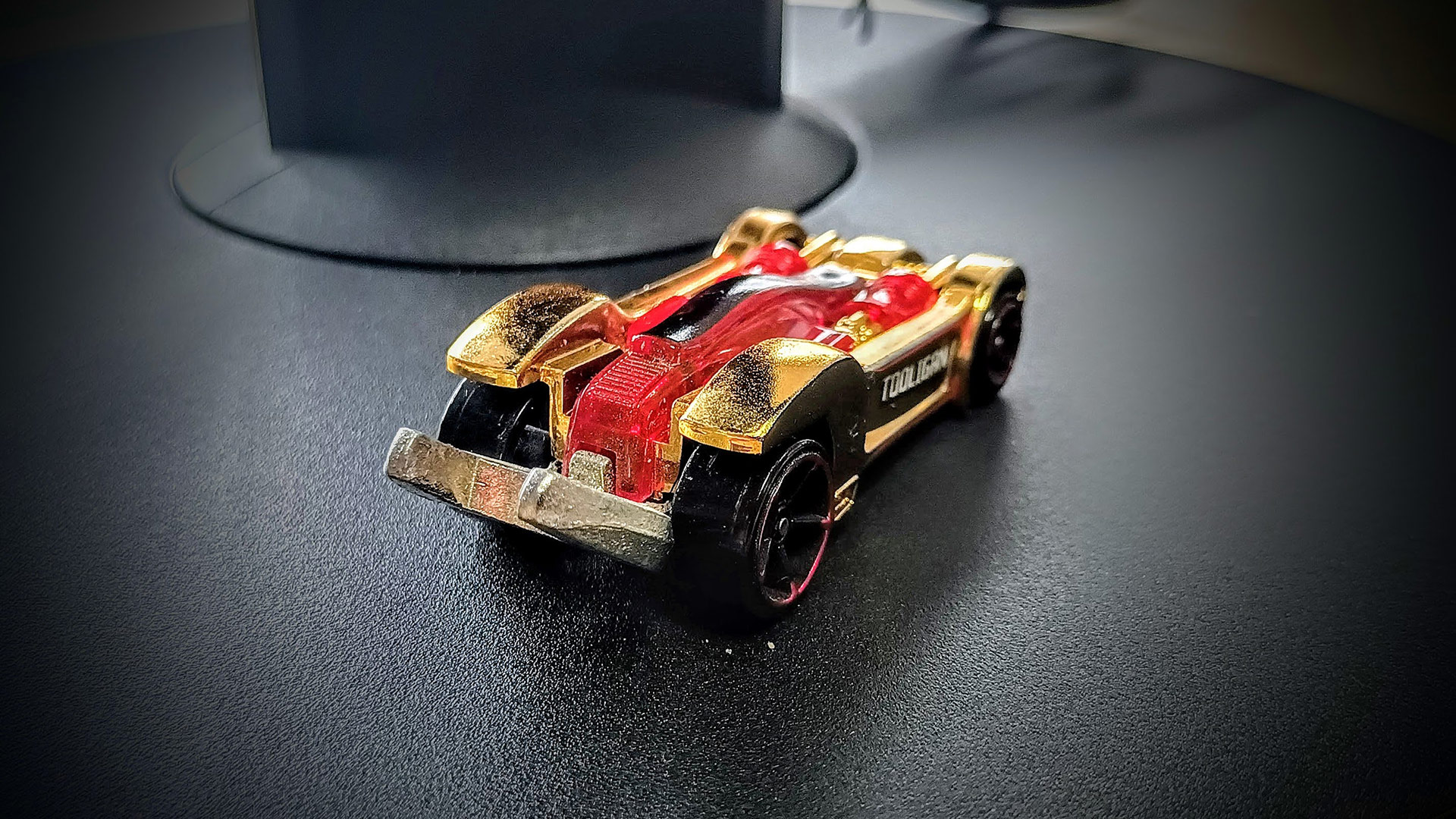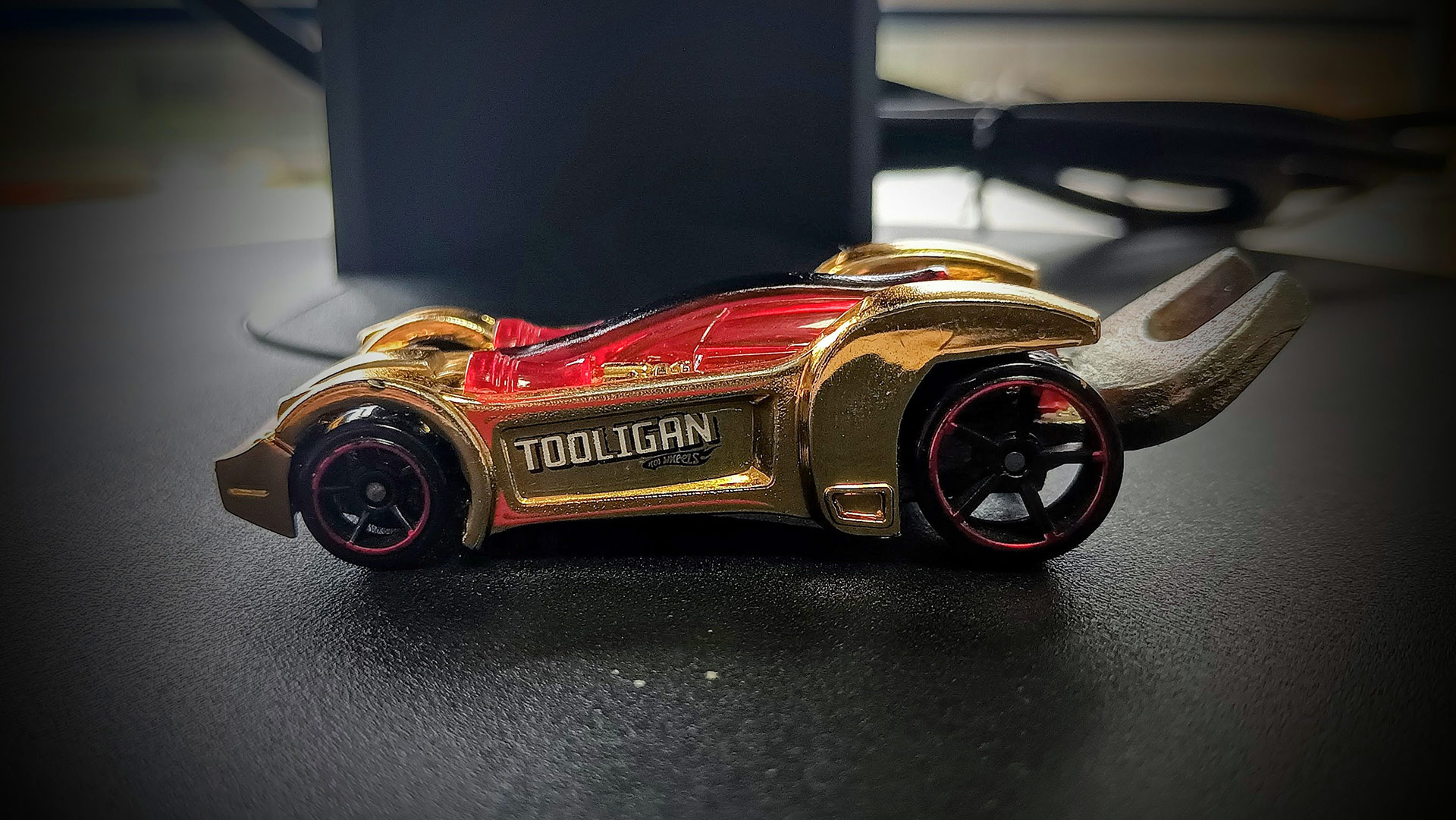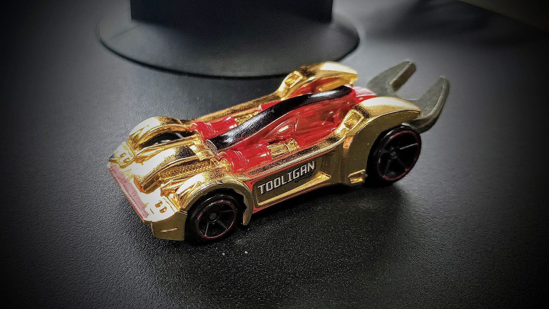 Poi la parte rossa definisce anche l'abitacolo con una serigrafia in nero ubicata sull'ipotetico tettuccio (impugnatura della pinza). Sui lati in corrispondenza dei portelli la scritta Tooligan (Yearling Bold) serigrafata in bianco con scivolamento in basso a destra e logo Hot Wheels in nero. Le ruote sono delle OH5 (bucate a 5 razze) con serigrafia cromata rossa.