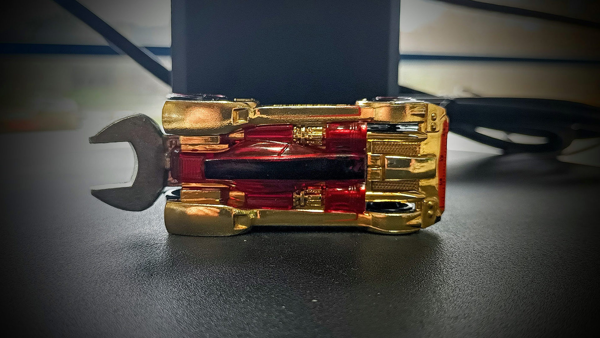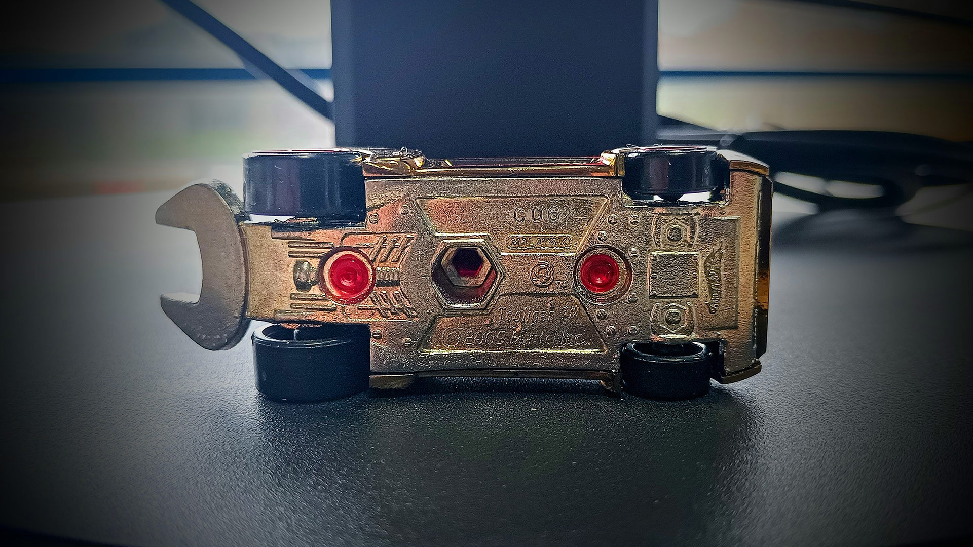 I parafanghi e i lati della carrozzeria riprendono la forma delle chiavi inglesi; l'alettone posteriore ha la forma di una chiave inglese da 3/8". Il corpo centrale e il parabrezza assomigliano a una pinza che si va a innestare all'alettone anteriore formato da un righello. Infine i motori sono formati da 2 gigantesti cacciaviti Phillips. Per quanto riguarda i materiali che la compongo, troviamo una base (scocca inferiore) in metallo (con la presenza centrale di un foro esagonale da 1/4"); carrozzeria superiore in plastica cromata oro con innestata una parte in plastica rossa trasparente, che delinea parte dei 2 motori cacciavite.